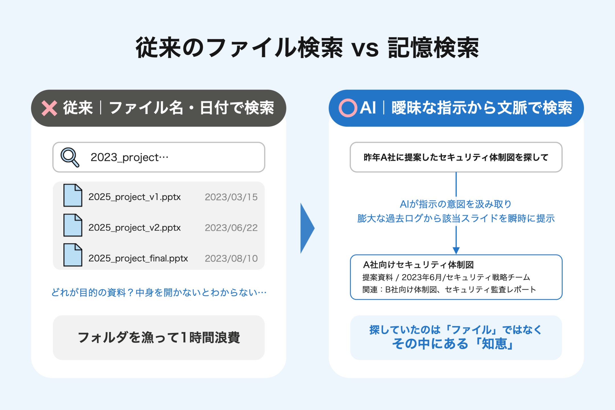 従来のファイル検索は、ファイル名や更新日という「記号」に依存しています。一方で、人が思い出したいのは「2023_project_v2.pptx」といった記号ではありません。「〇〇業界への参入障壁を分析したスライド」という文脈(コンテキスト)のはずです。