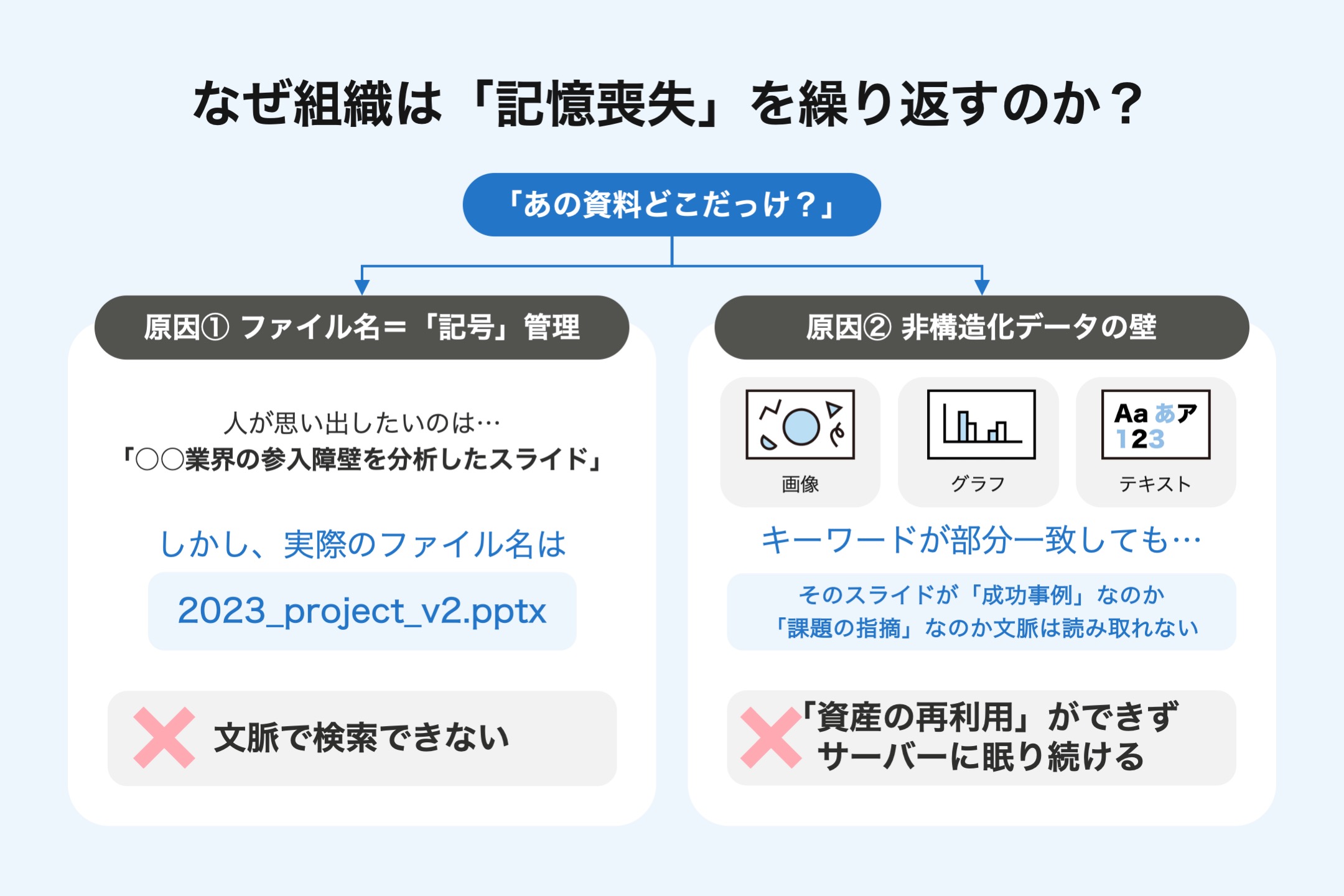 ビジネス資料の多くは、画像やグラフ、テキストが混在する「非構造化データ」です。キーワードが部分的に一致しても、そのスライドが「成功事例」なのか「課題の指摘」なのかといった文脈までは読み取れません。